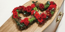 For this evocative tribute to a loved one we’ve carefully created two perfectly entwined hearts, using a varied selection of flower favourites including large-headed roses, carnations, alstromeria, spray chrysanthemums and germini, trimmed with foliage and moss. This tribute is available in either red or white.